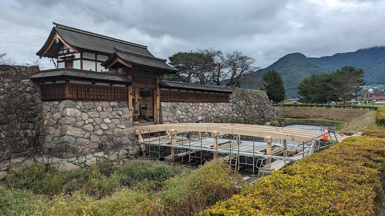 城下町より低い位置に築かれた“穴城”として知られる小諸城の城址公園。門や石垣、空堀が良好に残る。