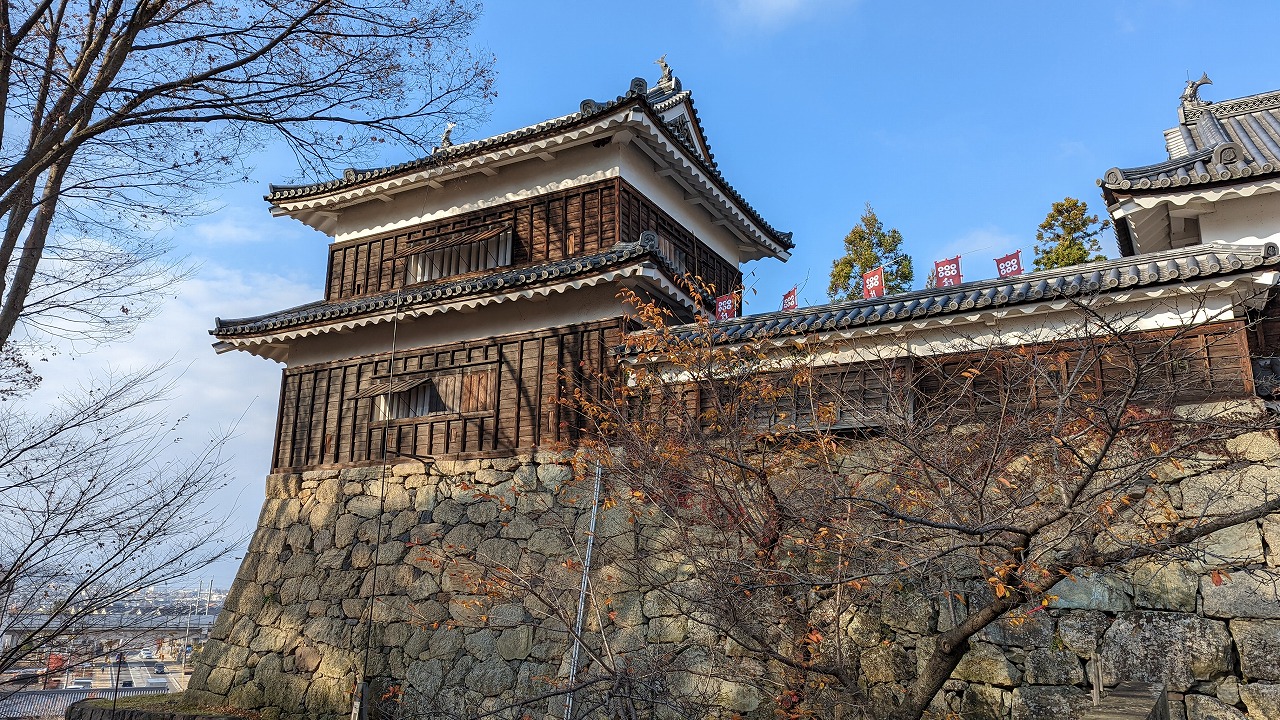 徳川家康ゆかりの城。堀と石垣が残り、復元された門や櫓とあわせて散策が楽しい。